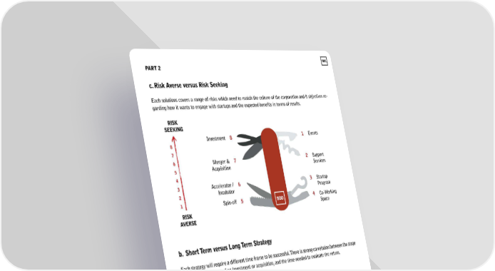 PART2 c. Risi< Averse versus Risi< Seeking Each solutions covers a range of risks which need to match the culture of the corporation and it objectives re- garding how it wants to engage with startups and the expected benefits in terms of results. RISK SEEKING Investment 8 I Events 8 7 6 Merger & 7 2 Support 5 Acquisition Services 4 3 Accelerator I 6 3 Startup 2 Incubator Program 1 Spin-off 5 4 Co-Working RISK Space AVERSE b. Short Term versus Long Term Strategy Each strategy will require a different time frame to be successful. There is strong correlation between the stage of the startup, the cost of an investment or acquisition, and the time needed to evaluate the return. LONGTERM 8 7 6 5 4 3 2 1 SHORT TERM INSEAD #500CORPORATIONS 23
