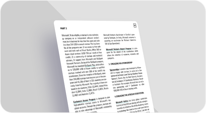 PART3 Microsoft. To be eligible, a startup (a new technolo- gy company or an independent software vendor) must be in business for less than five years and with less than IM USD in annual revenue. The key bene- fits of the programs are: 1) an access to free soft- ware and tools such as Visual Studio, Office 365 or Azure cloud services ( U SD 750 per month of free credit), 2) a community of startups and technical advisors, 3) support from Microsoft and BizSpark Network Partners. On top of the BizSpark program, Microsoft has launched BizSpark Plus, which offers up to 120,000 USD of Azure credits to qualified startups involved with over 200 of the world's top accelerators. Since the inception of BizSpark, more than 100,000 startups have become part of the pro- gram and 41,186 of them in 151 countries are cur- rently listed by Microsoft. The majority of them are based in six countries, USA (12,444), United l