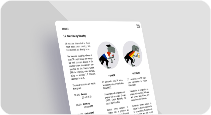 PART3 1.2 Overview by Country If you are interested to learn more about your countrx feel free to reach out directly to us. We focus on countries where at least 10 corporations are engag- ing with startups. France is the country where almost every cor- poration on the Forbes Global 500 is engaging with startups, using on average 1.7 different channels to do it. The top 5 countries are mostly European: 92.0% France 23 out of 25 71.4% Germany 15 out of 21 71.4% Switzerland 10 out of 14 56.8% Japan 25 out of 44 53.3% United Kingdom 16 out of 30 INSEAD #500CORPORATIONS 30