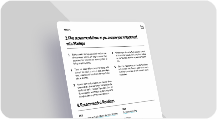 PART4 3. Five recommendations as you deepen your engagement with Statups Ta lk to a pool of startups about their needs as par t Whatever you choos e to do, be prepared to work 4 I at the speed of startups. Don't keep them waiting of your design process. It' s easy to assume 1hey would love this' when the bar or competitive of on you. You don't want the engagement to back ferings is getting higher. ire. There are many different ways to engage with Select the right pa rtners to share the knowledge 2 5 startups. The key is to keep in mind your objec and minimize risks. Doing it alone can be scary . Feel fr ee to reach out to us if you want recom tives, resources and time frame or expected re mendations. sults at all times. You can start small, choosing one channel of en 3 gagement at a time iterate and fast based on the results and buy-in. However if you don't shoot or enough big wins the from get go, there may not be enough to show to get you more resources. 4. Recommended Readings HBR BCG Corp orate Venturing Corp orate Venture Capital Av oid the Risk , Miss the Rewards Mc Kinsey Demystifying the hackathon Bloomberg The inside story of how - and why - Goldman Sachs TechCrunch became a tech-investing powerh ouse Corp orate Accelerators Are An Oxymoron Business Insider Why Cisco Has Showered These Three Men With Billions Of Dollars CB Insights Corp orate Venture Capital Te rm Sheet Survey CB Insights Inside the Minds of Corporate Venture Capitalists Global Corporate Venturing The World of Corporate Venturing 2015 INSEAD � The Business School #SOOCORPORATIONS 48 World� the for