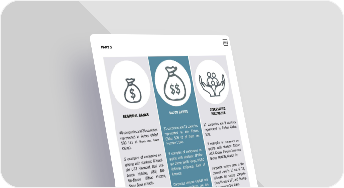 PART3 REGIONAL BANKS 48 companies and 24 countries represented in Forbes Global 500 (11 of them are from China). 5 examples of companies en- gaging with startups: Mitsubi- shi UFJ Financial/ !tau Uni- banco Holding/ UBS/ BB- VA-Banco Bilbao Vizcaya/ State Bank of India. Startup programs are the most widely used way for regional banks to engage with startups, (19 out of 48), followed by corĀ porate venture capital and startup competitions for 12 of them. INSEAD