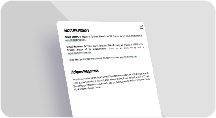 About the Authors Arnaud Bonzom is Director of Corporate Innovation at 500 Startups. You can contact him by email at [email protected]. g Serguei Netessine is the Timken Chaired Professor of Global Technology and Innovation at INSEAD and the Research Director of the INSEAD-Wharton alliance. You can contact him by email at [email protected]. Please direct questions and comments about this report via email to: [email protected]. Acl