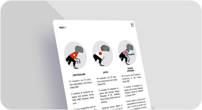 PART3 SWITZERLAND 14 companies and 12 indus- tries represented in the Forbes Global 500. 5 examples of companies en- gaging with startups: Nestle 1 U BS ABB Syngenta Swiss- 1 1 1 com. Startup competitions and cor- porate venture capital with five corporations are the most used solutions to engage with start- ups1 followed by Startup Programs offered by four cor- porations. INSEAD