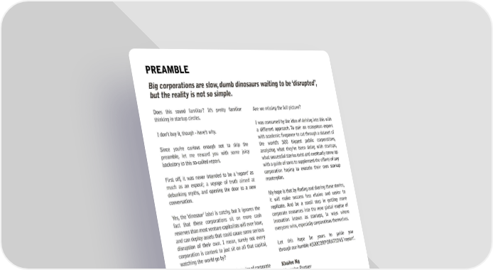 PREAMBLE Big corporations are slow, dumb dinosaurs waiting to be 'disrupted', but the reality is not so simple. Does this sound familiar? It's pretty familiar Are we missing the full picture? thinking in startup circles. I was consumed by the idea of delving into this with I don't buy it, though - here's why. a different approach. To pair an ecosystem expert with academic firepower to cut through a dataset of Since you're curious enough not to skip the the world's 500 biggest public corporations, preamble, let me reward you with some juicy analyzing what they've been doing with startups, backstory to this so-called report. what successful stories exist and eventually come up with a guide of sorts to supplement the efforts of any First off, it was never intended to be a 'report' as corporation hoping to execute their own startup much as an expose; a voyage of truth aimed at masterplan. debunking myths, and opening the door to a new conversation. My hope is that by finding and sharing these stories, it will make success less elusive and easier to Yes, the 'dinosaur' label is catchy, but it ignores the replicate. And be a small step in getting more fact that these corporations sit on more cash corporate resources into the new global engine of reserves than most venture capitalists will ever have, innovation known as startups, in ways where and can deploy assets that could cause some serious everyone wins, especially corporations themselves. disruption of their own. I mean, surely not every corporation is content to just sit on all that capital, Let this hope be yours to guide you watching the world go by? through our humble #500CORPORATIONS 'report'. Maybe there are just not enough stories of corporate Khailee Ng + startup collaborations thundering through Managing Partner Or perhaps corporations mainstream consciousness. 500 Startups who are doing all the right things simply don't want you to know about it. Funny how we hear stories of acquisitions which made the founders rich, and then the corporation eventually shut down the startup they bought-and we think "What idiots!". #500CORPORATIONS 2