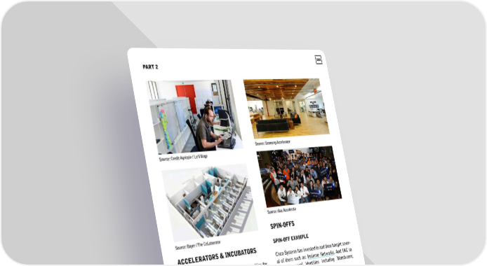 PART2 Source: Samsung Accelerator Source: Credit Agricole I Le Village Source: dtac Accelerate SPIN-OFFS Source: Bayer /The Colaborator SPIN-OFF EXAMPLE ACCELERATORS & INCUBATORS Intel was a spin-out of Fairchild, Cisco Systems has Accelerators & Incubators provide opportunities for invested in and then bought several of them such as: corporations to support a small group of startups Insieme Networks. And IAC to spin-off several iden- during a relatively short period of time (most of the tities including Match.com, Tinder and OkCupid.com. time between three and six months). Typically, cor- porations offer founding help, space and mentoring INVESTMENT in exchange for equity. The first such program was launched 10 years ago by Y Combinator. Corporate The main goal of an investment is to own a stake in accelerators represent a perilous strategy due to a fast growing-startup for strategic or financial rea- high cost and a very small sample of startups to work sons. A financial investment is often done with the with. goal of a financial return whereas a strategic invest- ment is done most of the time for a supplier, custom- ACCELERATOR & INCUBATOR EXAMPLES er or competitor with the main purpose of integra- tion down the road. A strategic investment could also Accenture, Telenor, Mastercard, Volkswagen and be done from the perspective of diversification. Such Samsung have an accelerator, respectively: Fintech investments can be done through a variety of vehi- Innovation Lab, dtac Accelerate, Start Path, cles including: Volkswagen ERL Technology Accelerator and Samsung Accelerator. INSEAD ------,-- The Business School #500CORPORATIONS 20 for the World *